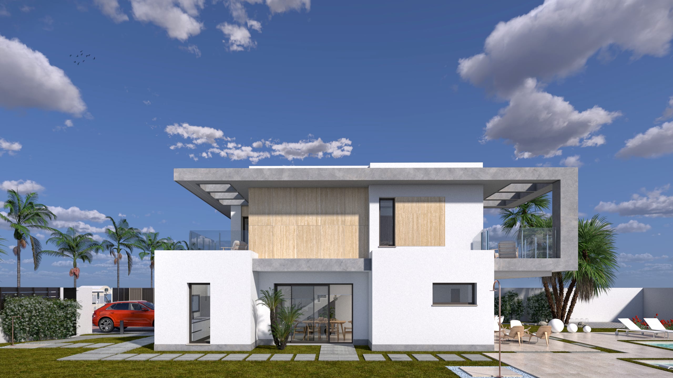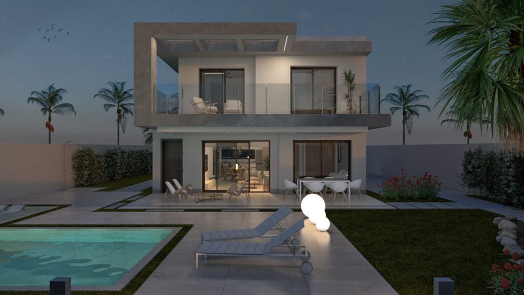 La parcela imponía retranqueos severos que obligaban a una vivienda compacta. En lugar de verlo como una limitación, se convirtió en la clave del proyecto: reducir la huella construida para liberar vida exterior. Así aparece una piscina amplia rodeada por una playa generosa donde cada miembro de la familia encuentra su propio espacio. Un lugar flexible, sereno y lleno de pequeñas escenas cotidianas.